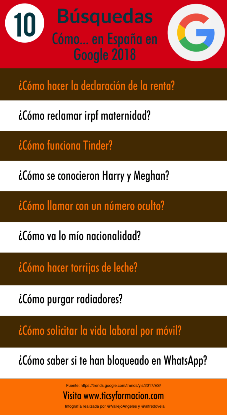 10 búsquedas Cómo … más realizadas en Google en España 2018 #infografia #Infografía – relacionado con Infografía, Sociedad de la información, Google, internet, tic Vía: TicsyFormación