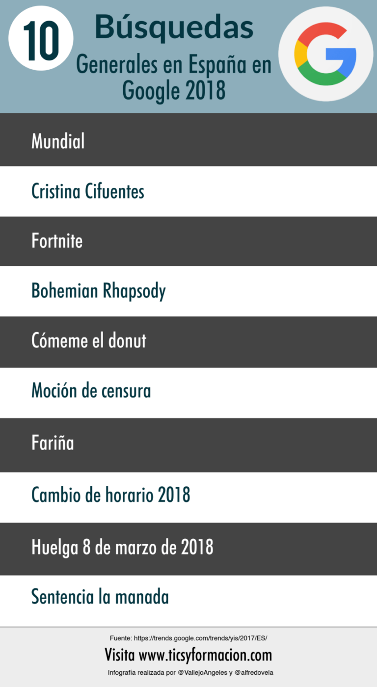 10 búsquedas generales más realizadas en Google en España 2018 #infografia #Infografía – relacionado con España, Infografía, Sociedad de la información, Google, internet, tic Vía: TicsyFormación
