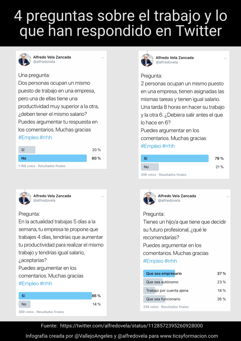 4 preguntas sobre el trabajo y lo que han respondido en Twitter #infografia #rrhh #Empleo #Infografía – relacionado con Infografía, Inserción laboral, RRHH Vía: TicsyFormación
